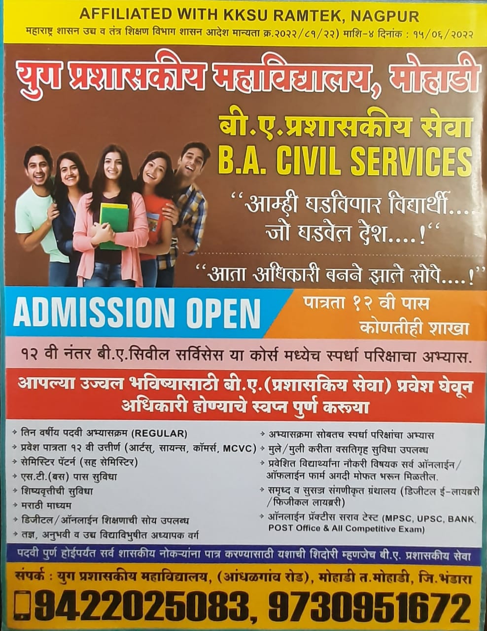 Yug Prashaskiya Mahavidyalaya, Mohadi, Dist. Bhandara with Senior Level Now B.A. in Civil Services. Now it has become one important college in Bhandara District. The aim of our college is to teach the student & develop them fully to serve the nation.